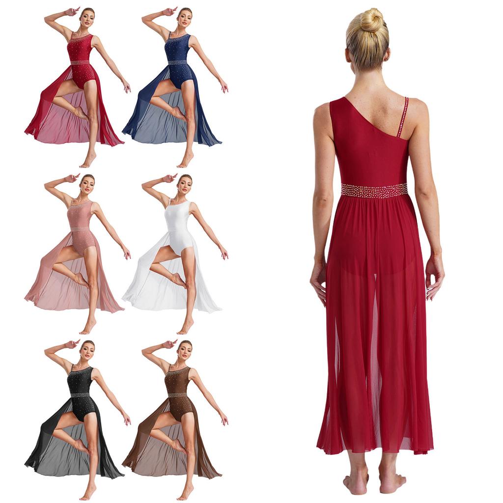 Lyrical Dance Dress for Women Sleeveless Glittery Rhinestones Asymmetrical Sheer Mesh Performance Wear