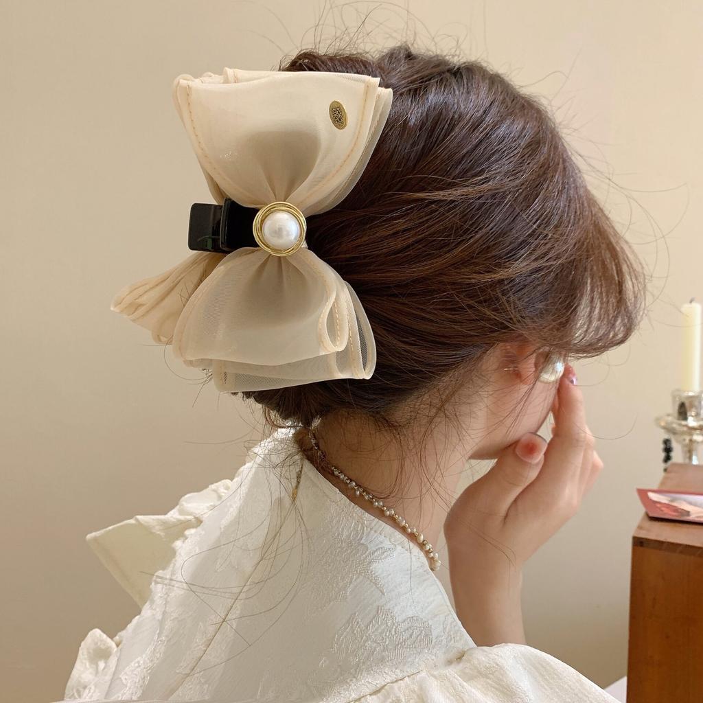 Korean Version of Pearl Mesh Bow Hairpin Simple Light Luxury Large Grab Clip Small Fragrance Versatile Shark Clip Hair Accessories