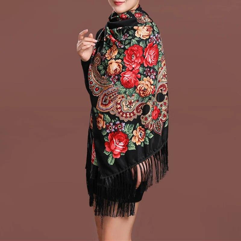 Flower Print Black Tassel Scarf Vintage Windproof Shawl Women Outdoor Windproof Head Wrap Boho Hijab Turban 170*65Cm