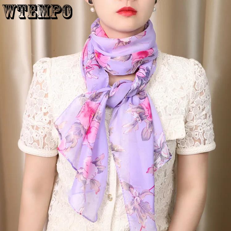 WTEMPO New Vintage Elegant Printed Chiffon Scarf for Four Seasons Women's Fashion Versatile Long Scarf for Neck Protection and Sunscreen Scarf