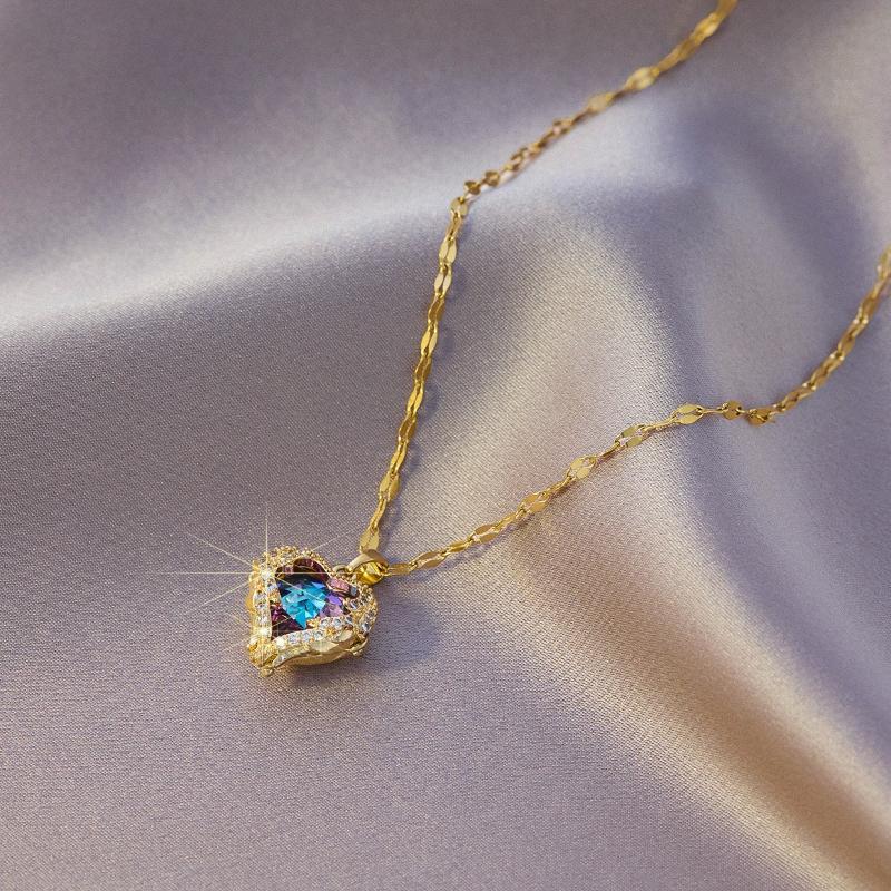 Top Luxury Colorful Crystal Ocean Heart Pendant Necklace for Women Trendy 316L Stainless Steel Jewelry Female Wedding Neck Chain