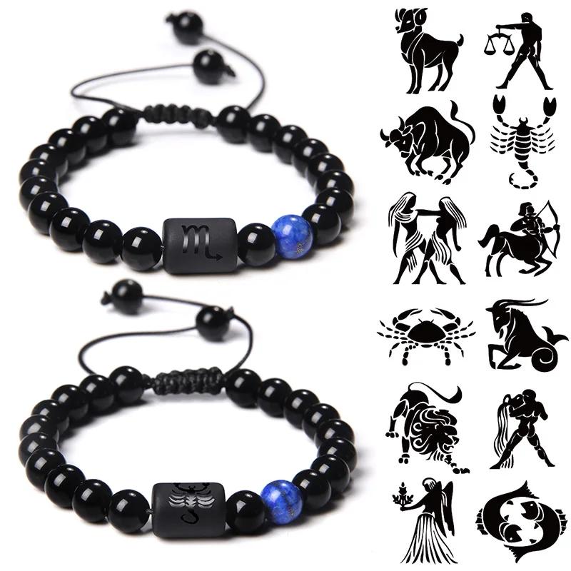 12 Constellation Zodiac Signs Bracelet Black Onyx Beads Cancer Leo Onyx Braided Bracelet for Women Men Couples Jewelry Gift