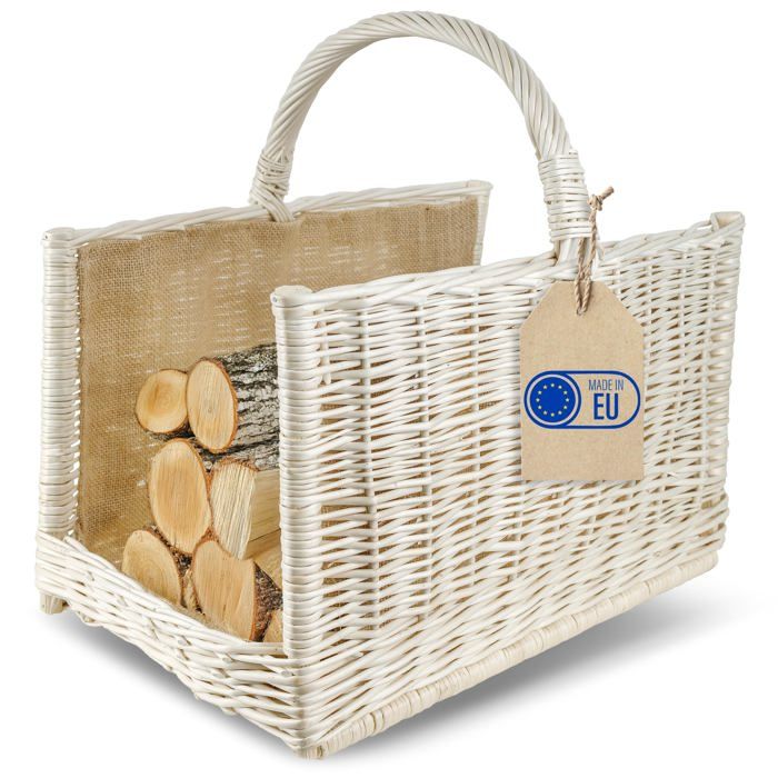 Panier à bûches - CREATIVE HOME - Cheminée - Osier 100% naturel - Poignée - Blanc 50x34x50 cm