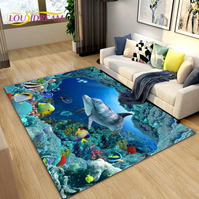 3D Carpet Seabed Illusion Underwater World Dolphin Shark Area Rug,Rug for Living Room Bedroom Sofa Doormat,Non-slip Floor Mat
