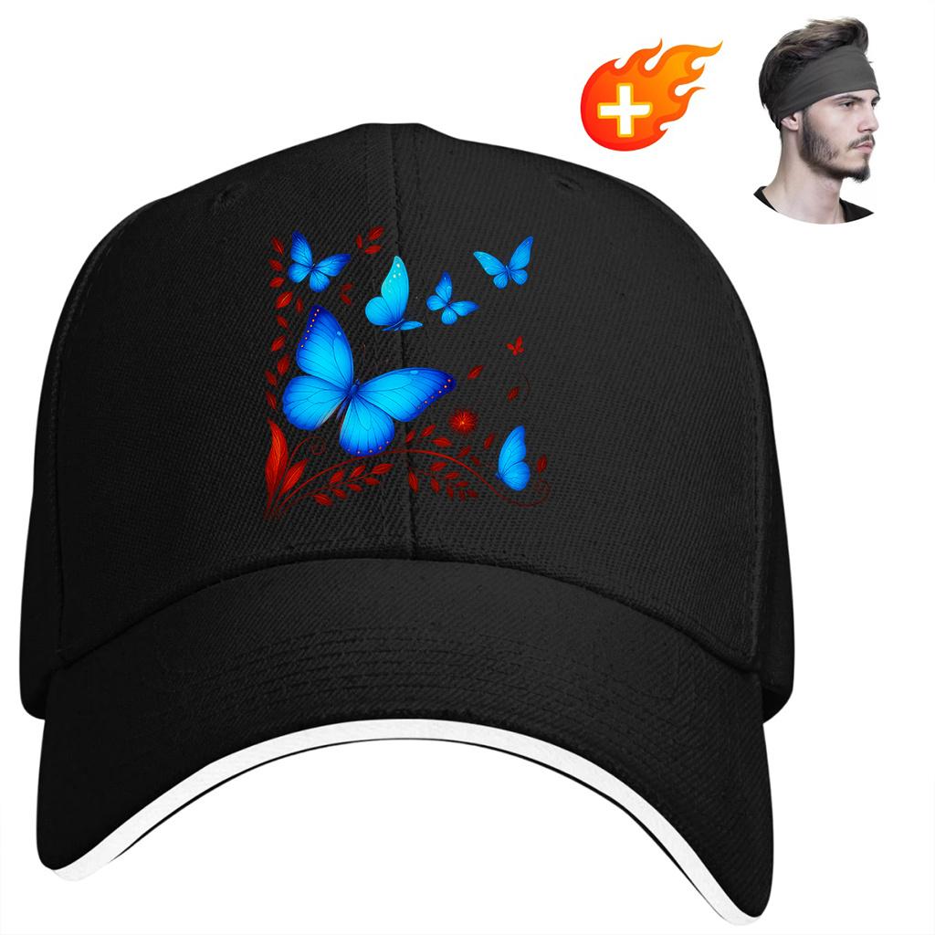 Blue Butterfly Floral Print Baseball Cap Adjustable Polyester Casual Dad Hat for Unisex Adults