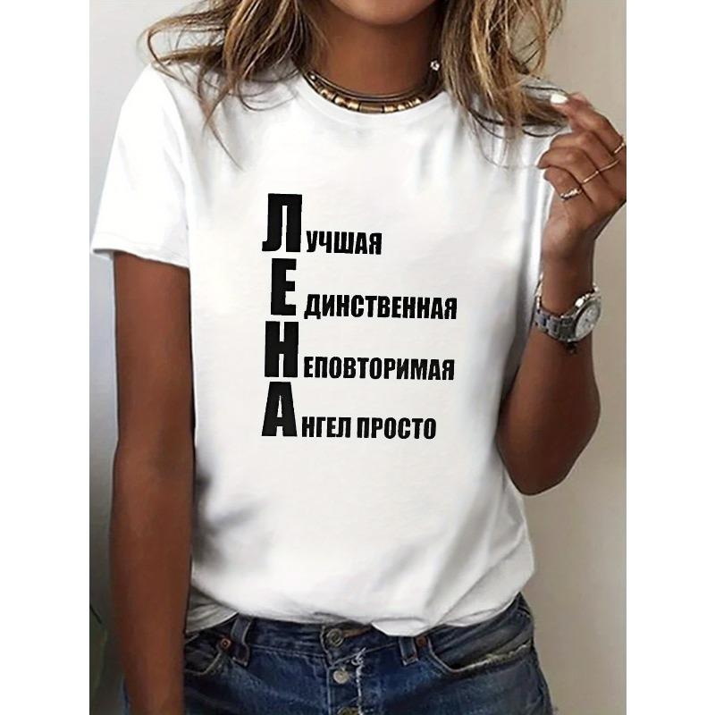 Women's White Cyrillic Alphabet T-Shirt Short Sleeve Crew Neck Casual Top