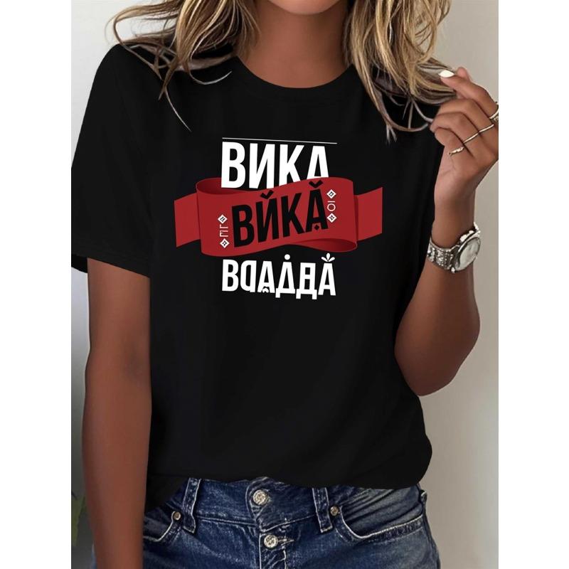 Unisex Russian Cyrillic Text Print T-Shirt Black Short Sleeve Round Neck Casual Streetwear Top