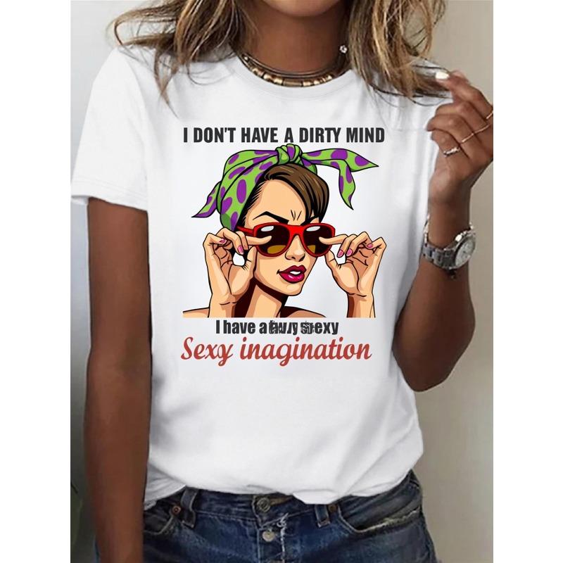 European Sizes 1pc Women's Funny Slogan T-Shirt "I Don't Have A Dirty Mind I Have A Sexy Imagination" Print - Soft Stretch