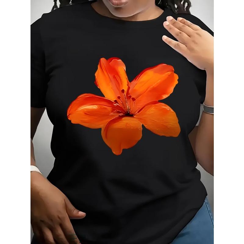 Women Plus Size Hibiscus Print T-Shirt Orange Yellow Hawaiian Floral Crew Neck Short Sleeve Spring Summer Beach Casual Oversized Top