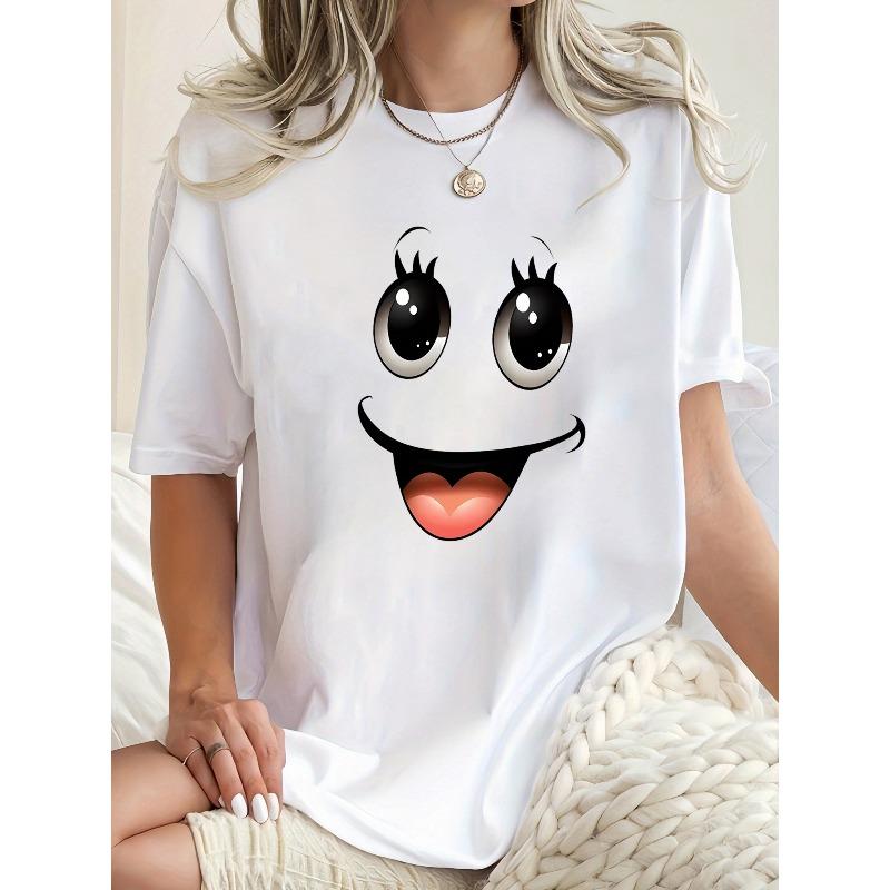European Size Fashion Women's Short-Sleeve T-Shirt - Adorable Cartoon Smile Print, Lively and Fun. Easy-to-match Comfortable Casual Round-neck Top