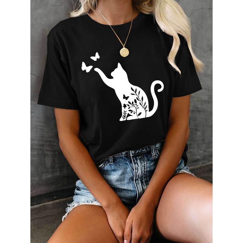 European Size Cat Print Pure Short-Sleeved Casual T-Shirt