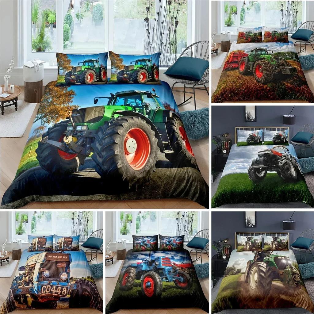 Retro Tractor King Queen Duvet Cover Car Bedding Set Engineering Vehicle Quilt Cover Farm Tool Cart Polyester Quilt Cover