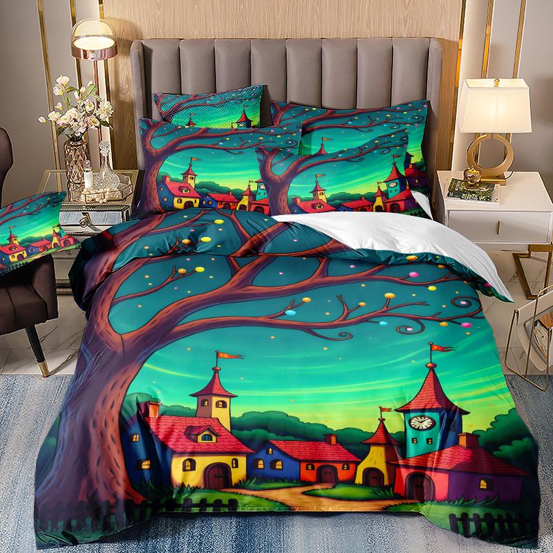 3pcs Art Style 3D Moonlit Cottage Pattern Duvet Cover Set, 1 * Comforter Cover + 2 Pillowcases, No Insert Included. Ultra-Soft