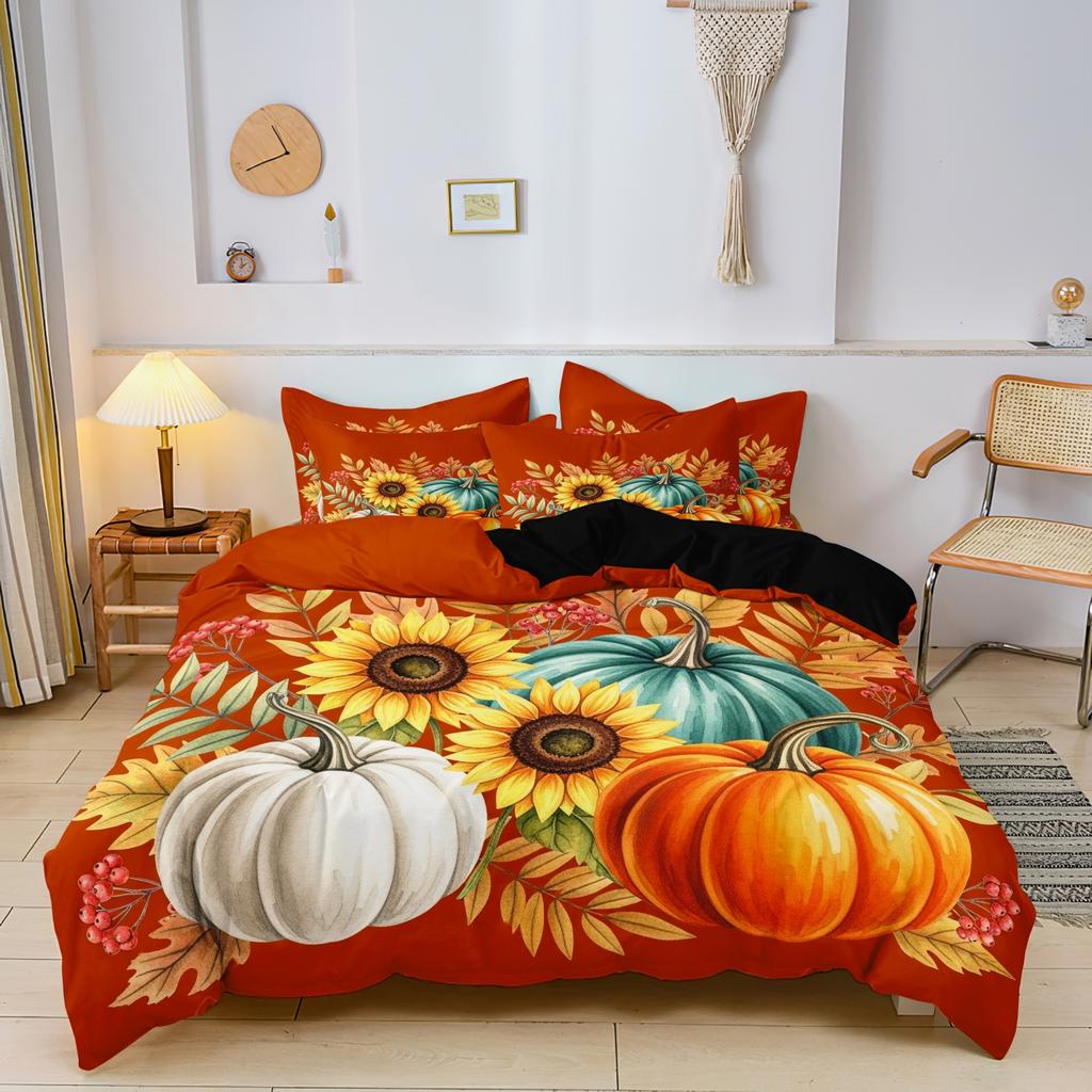 3pcs Autumn Pumpkin Sunflowers Stic Field Leaf Theme Duvet Cover Set,Thanksgiving Season Christmas Easter Autumn Gifts,