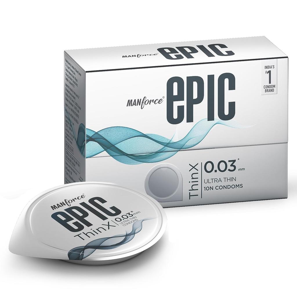 Manforce Epic Thinx Ultra Thin Condoms for Men - 10 Count| 0.03mm| Vegan| No Harsh Chemicals| Easy Peel Pack with Disposable Pouch