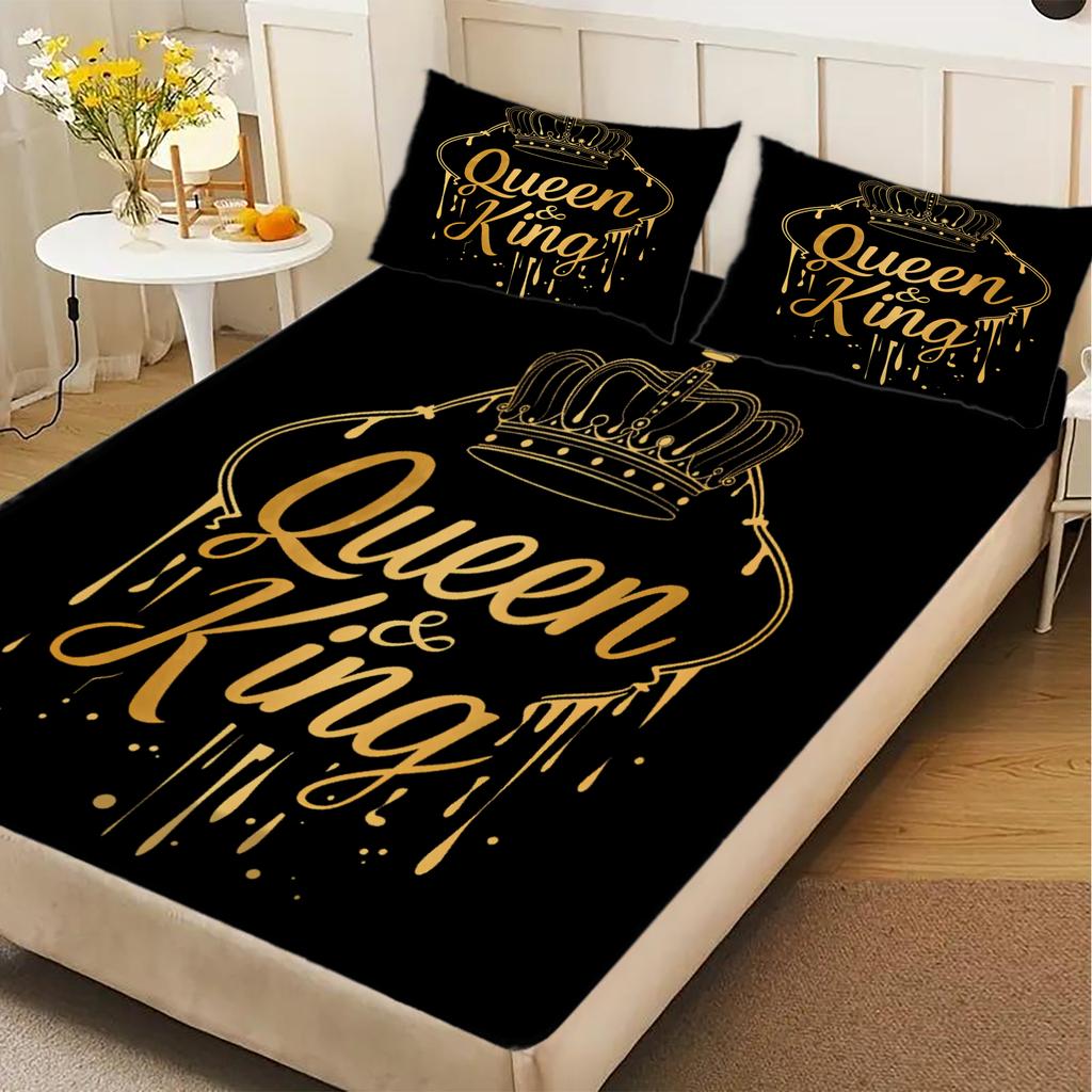 Queen And King Fitted Sheet Set Black Gold Crown Print Bedding With Pillowcases For Couples Bedroom