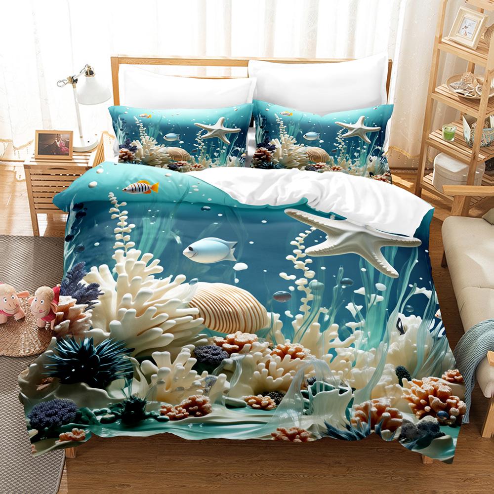 3pcs Blue Queen King Size Duvet Cover With 2 Pillowcases 3D Printed Coral Reef Sealife Soft Bedding Sets Comforter Not Included