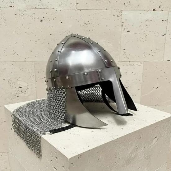 This helmet is inspired by the iconic Viking nasal helmet / Norman helmet worn during medieval battles and crusades. The strong nasal guard protects the nose and face, while the attached chainmail (aventail) adds extra neck and shoulder protection, giving it a realistic and battle-ready appearance.