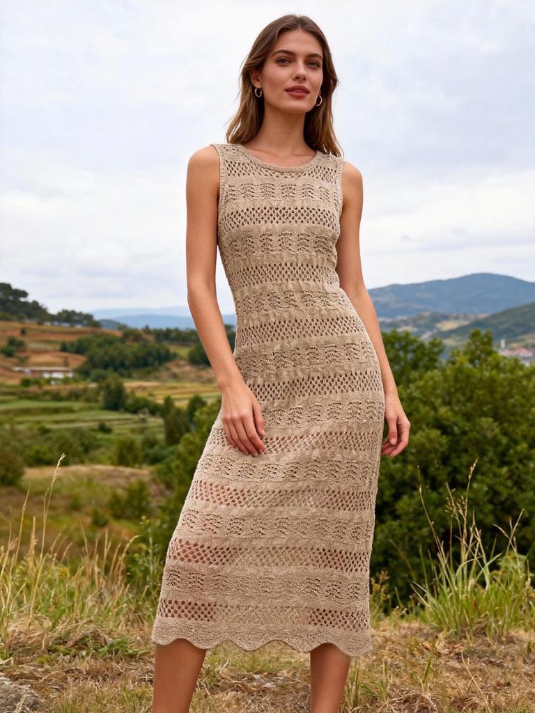 Hot Selling European & American Style Solid Color Knit Beach Maxi Dress - Round Neck, Sleeveless, Sexy.