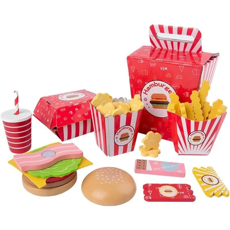 Wooden Fast Food Diner Set Toy for Kids Pretend Kitchen Play Classic American Meal Realistic Food Set Burger French Fries Cola