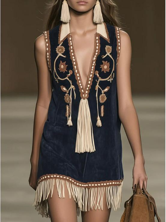 Elevate your style with this chic sleeveless mini dress, designed to make a statement. Crafted from soft polyester, it offers a luxurious suede feel. The dress features intricate bohemian embroidery that adds a touch of artisanal charm, while playful tassels provide a whimsical finish. Perfect for a day out or an evening event, this dress effortlessly combines comfort with a trendy, free-spirited aesthetic.