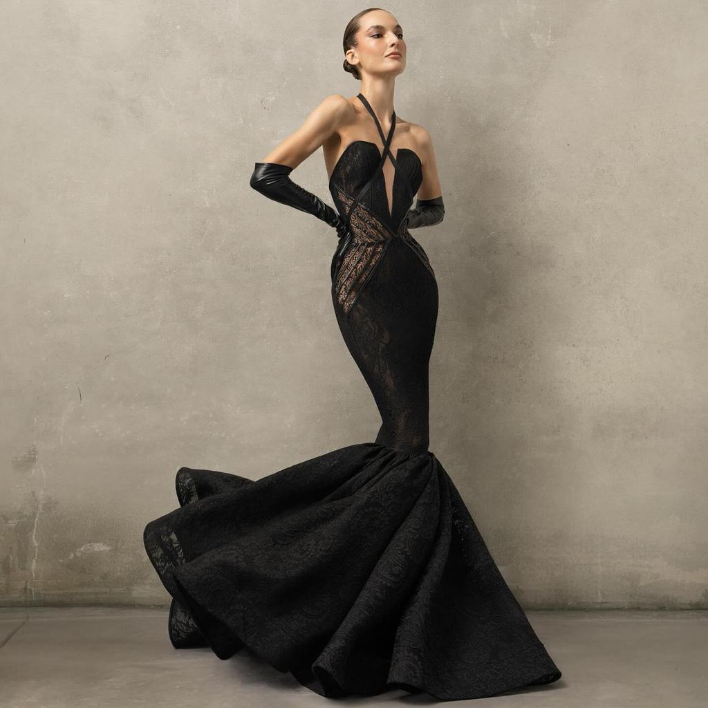 2025 Winter Women's Sexy Halter Deep V-neck Lace Backless Dress