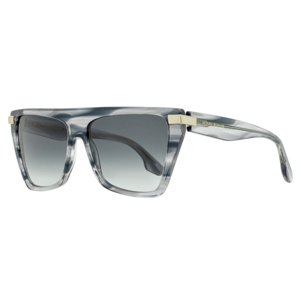 The Victoria Beckham VB 684S sunglasses feature a tapered rectangular shape with sculpted lines, designed specifically for women. The acetate frame is enhanced with a ribbed gold metal hinge design, adding a touch of elegance. These sunglasses provide 100% UV protection against the sun's harmful rays, making them functional as well as fashionable. The frame color is Gray Horn, while the lens color is Gray Gradient.