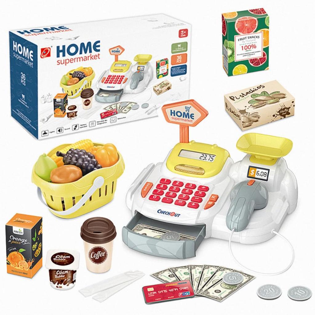 [Product Details] 36-piece set including cash register, basket, bills, coins, credit cards, vegetables, drinks, etc. Dimensions: 32cm x 11cm x 18cm. Requires two AA batteries (sold separately). Ages 6 and up.