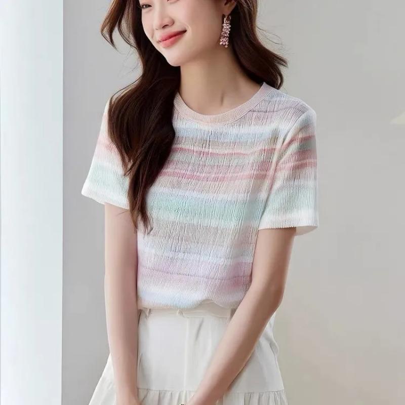 Women's Pastel Rainbow Striped T-Shirt Casual Crew Neck Short-Sleeve Slim Fit Knit Top