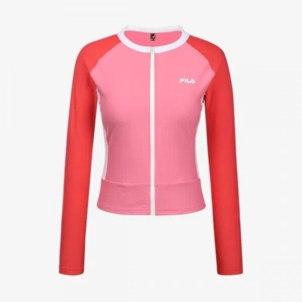The Fila Zip-Up Rash Guard FS2RTG2451FPIK features a convenient full zip design, making it easy to put on and take off, with an integrated bra cup that allows for wear without separate innerwear. Made from stretchy tricot fabric, it offers comfort during swimming and water sports. The color is Ivory.