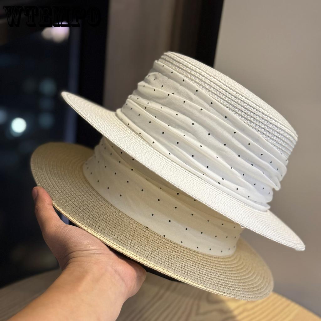 Spring and Summer Sunscreen Elegant French Polka Dot Vacation Top Hat Women Travel Beach Hat Fashion Flat Top Straw Hat