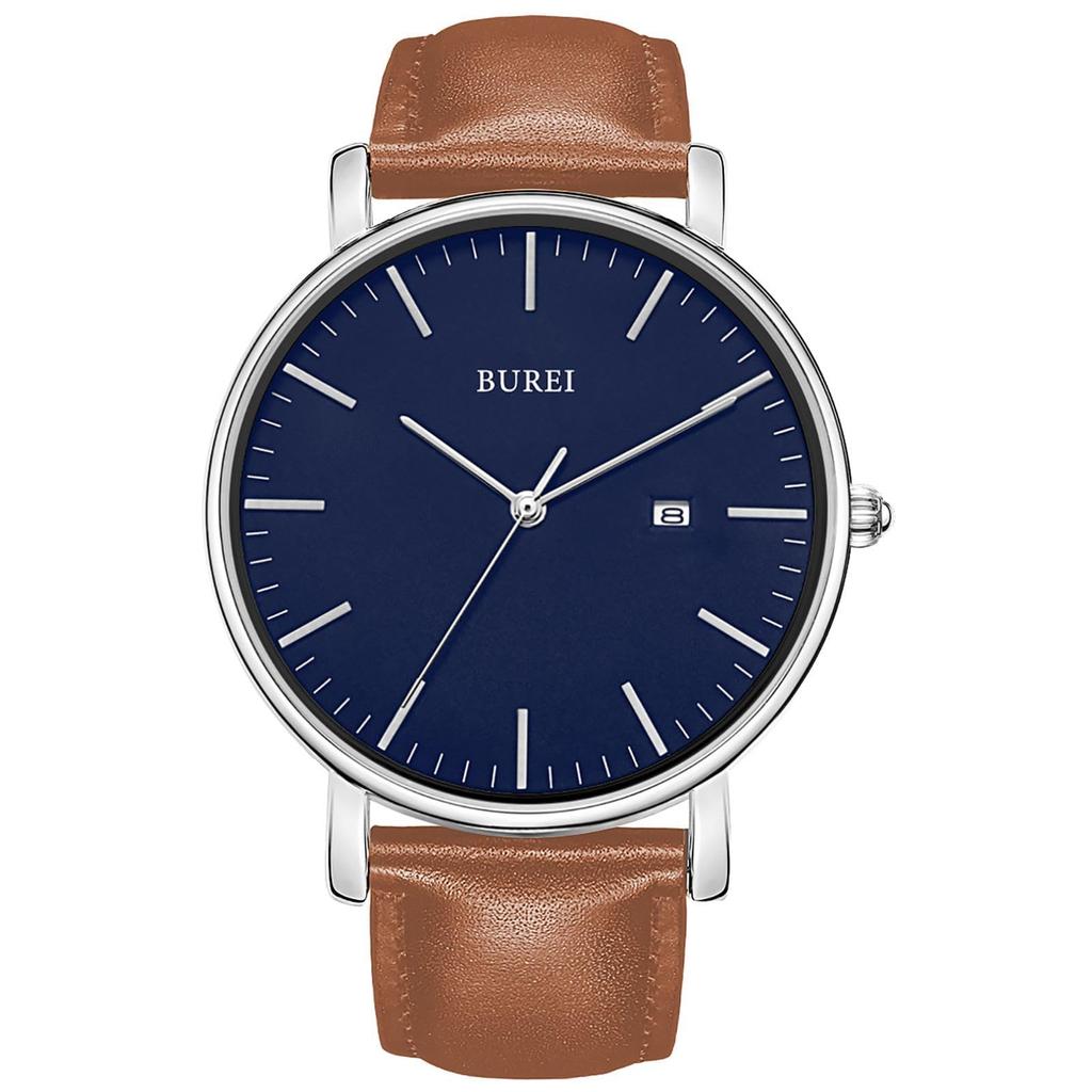 BUREI Leather Popular Simple Perfect for Commuting Men's Watch, Brand, Analog, Waterproof, Stylish, (Blue-Brown) [Used]
