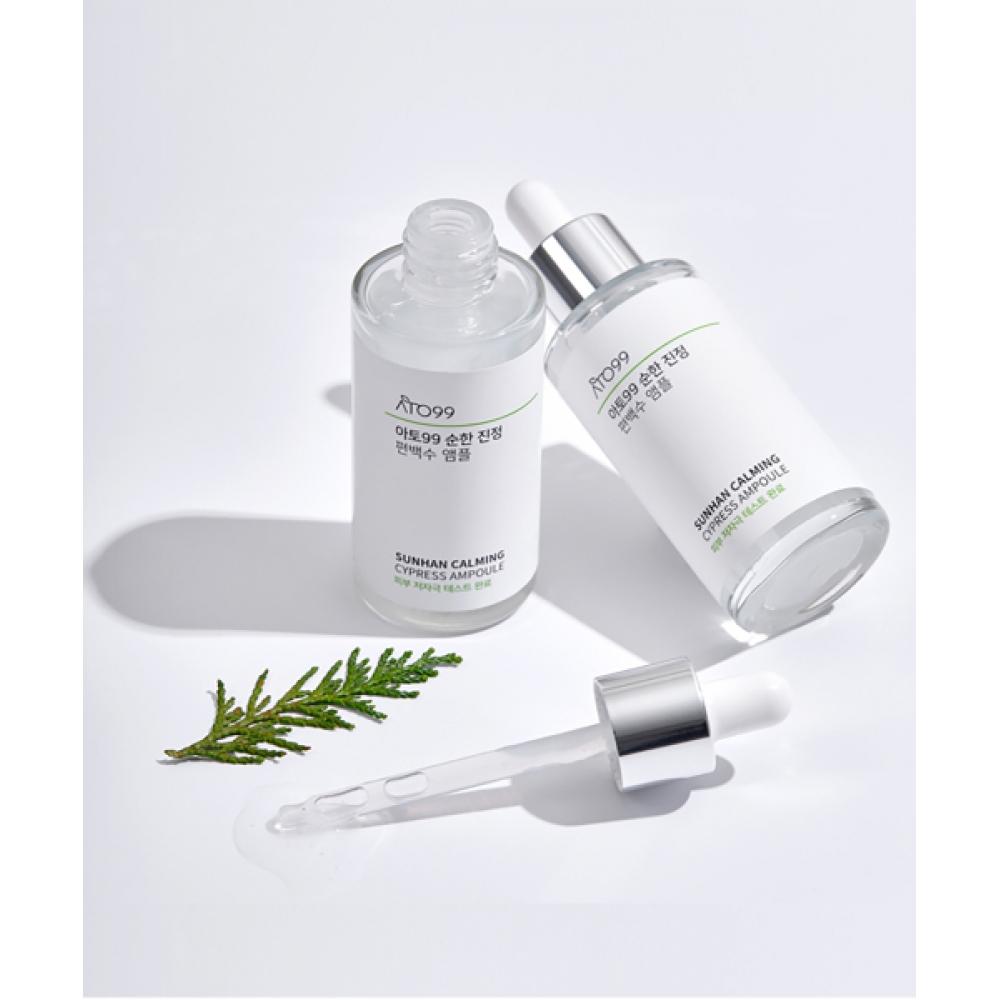 ATO99 Cypress Water Sica Soothing Ampoule 50ml + 50ml is a soothing ampoule combining cypress water and sica components. This product helps calm and moisturize the skin, particularly effective for dryness. It provides hydration to dehydrated skin and protects it from daily stress.