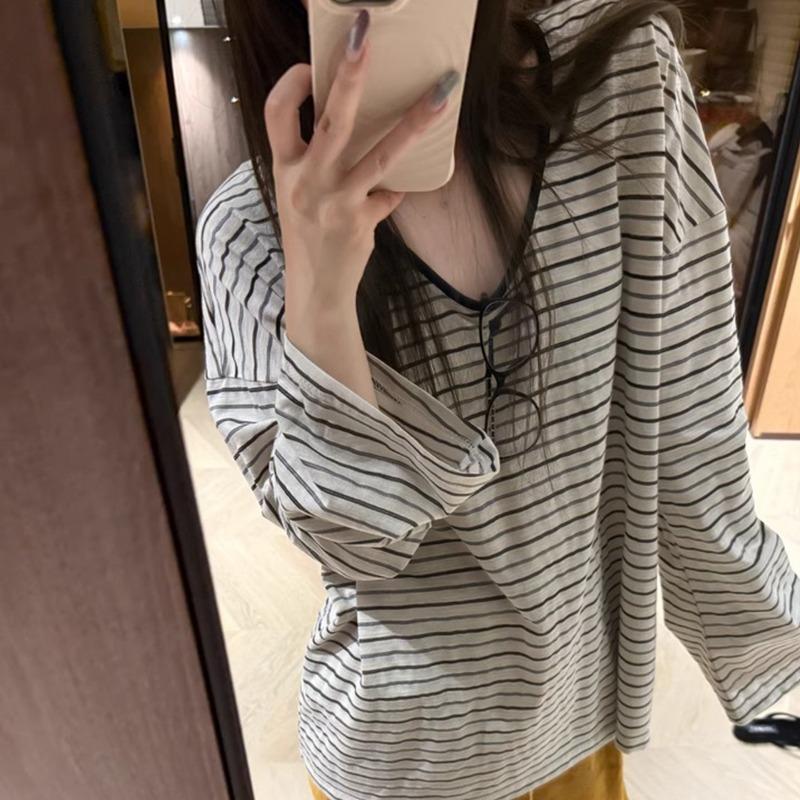 Contrast Striped Long-sleeved T-shirt for Women Summer Thin Blouse Loose Lazy Relaxed and Temperamental Top