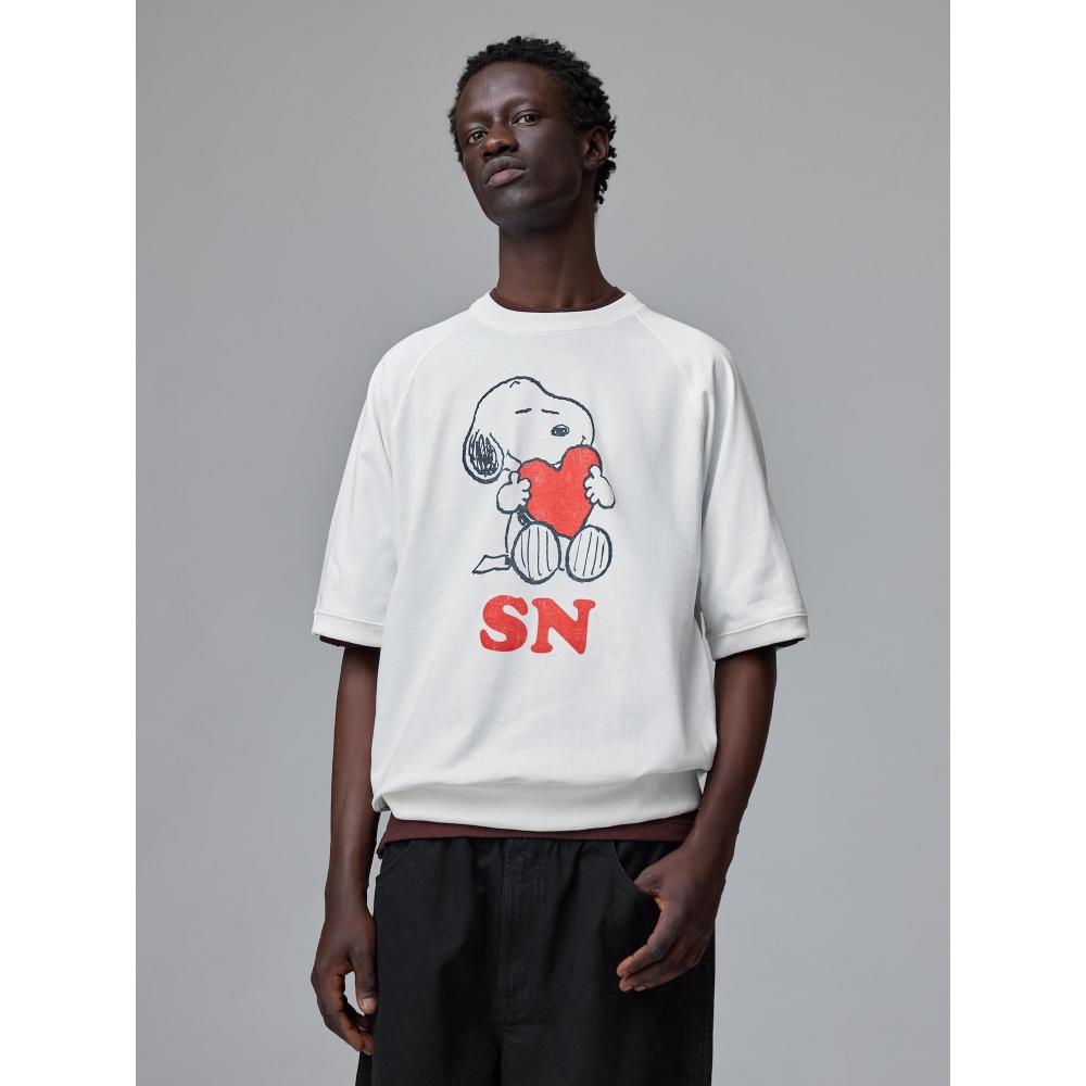 This is a product from the GU × UNDERCOVER collection, featuring a collaboration with the renowned Japanese fashion brand 'UNDERCOVER' and the globally loved 'PEANUTS'. It's a summertime essential, the 'Sweat T', offered in various patterns and colors for enjoyment. The product showcases graphic designs themed around Snoopy with hearts, vampires, and Charlie Brown on a skateboard. The back features a message print, and it has an oversized design for comfortable wear.