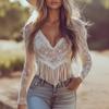 Elevate your spring and summer wardrobe with this stylish women's v-neck shirt, crafted with delicate lace material. The solid-patterned shirt offers a relaxed, loose fit for optimal comfort. Its long sleeves are elegantly adorned with intricate fringe, adding a touch of playful sophistication. The hollow design enhances its airy feel, making it a perfect choice for warm weather. Whether paired with casual jeans or a chic skirt, this shirt is a versatile and elegant addition to any outfit.