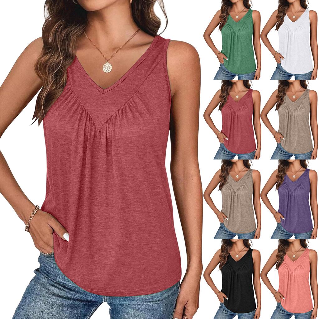 Women's Color Sleeveless Camisole Pleated Versatile V-neck T-shirt Top