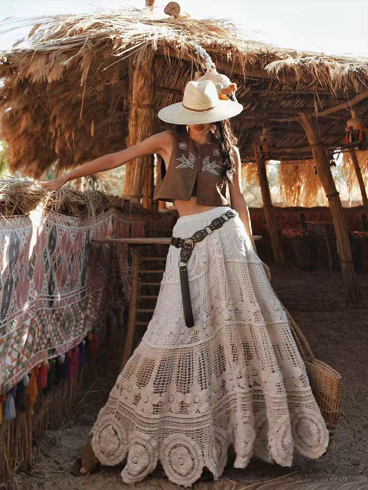 Elastic Waist Crochet A-Line Skirt - Korean Style, Mid-Length, Embroidered, Wide Hem, Slimming Design