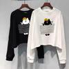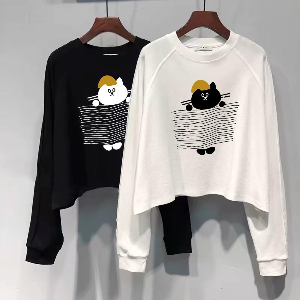 Women's Stylish Long Sleeve Cartoon Cat Cotton T-Shirt - Casual Loose Fit