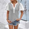 This women's casual T-shirt is designed with a chic striped patchwork pattern and features short puff sleeves for a trendy look. Made from high-quality polyester, it offers a lightweight and comfortable fit, perfect for everyday wear. The V-neckline adds a touch of elegance, making it versatile for both casual outings and more dressed-up occasions.