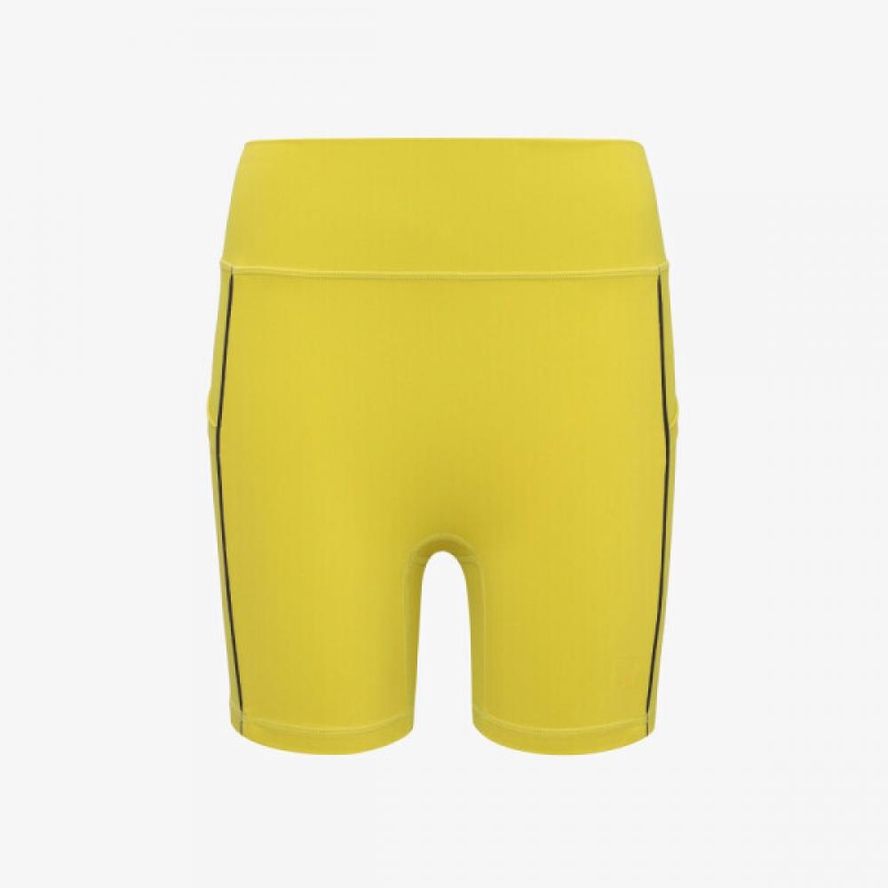 The FILA 4-Pocket Biker Shorts FS253IP02F003_734 is women's sportswear characterized by a high-waisted design. This product provides stable wearing comfort by firmly supporting the abdomen, and its biker shorts form gives a visual effect of longer, slimmer legs. There are pockets at the back of the waist and both sides for conveniently storing smartphones and belongings during exercise. Made from functional materials suitable for sports activities, it emphasizes a comfortable fit similar to leggings. The color is provided as Green-yellow.
