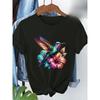European Sizes Floral Hummingbird Print T-Shirt Short Sleeve Round Neck Casual Top, Regular Length, All-Season Wear, Women's
