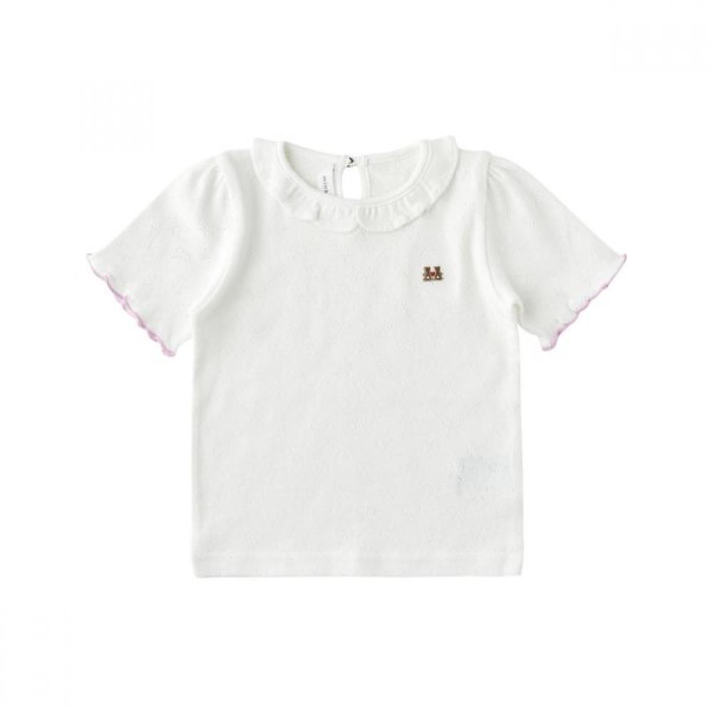 The IV) Amiel Muri Ribbon Eyelet T-Shirt is a 4-part short-sleeved t-shirt woven with elastic breathable fabric and a ribbon-shaped eyelet jacquard. The clean ivory color combined with decorative details at the sleeve ends creates a unique design, while the emblem embroidery on the chest adds originality. This versatile shirt pairs easily with various items, suitable for both indoor and outdoor wear.
