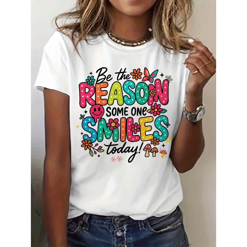 European Size Smile Today Quote Positive Graphic Print T-shirt, 90s Short Sleeve Crew Neck Casual Top for Summer & Spring, Women's Clothing