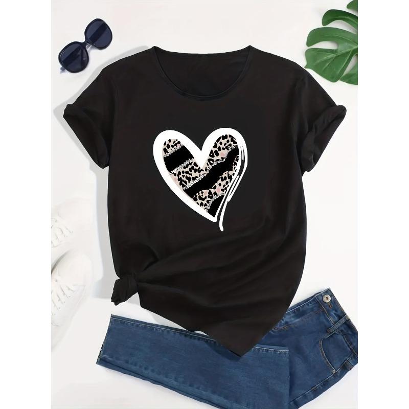 Womens Casual Sports Loose Heart Graphic T Shirt Leopard Print Round Neck Letter Printed Summer Workout Top