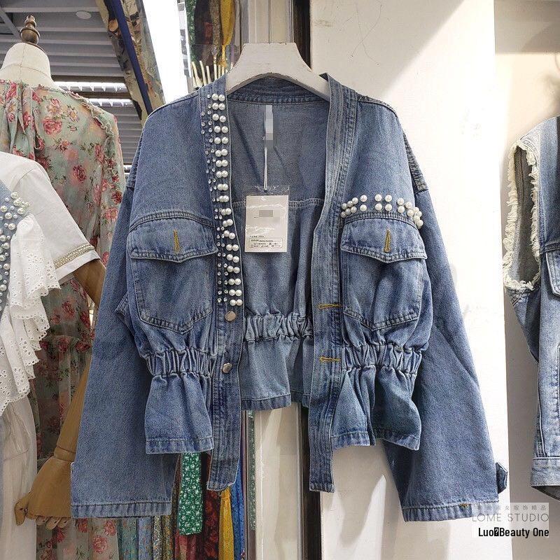 Women's Spring/Fall Beaded Denim Jacket - Korean Loose Fit, Waist-Cinched Style