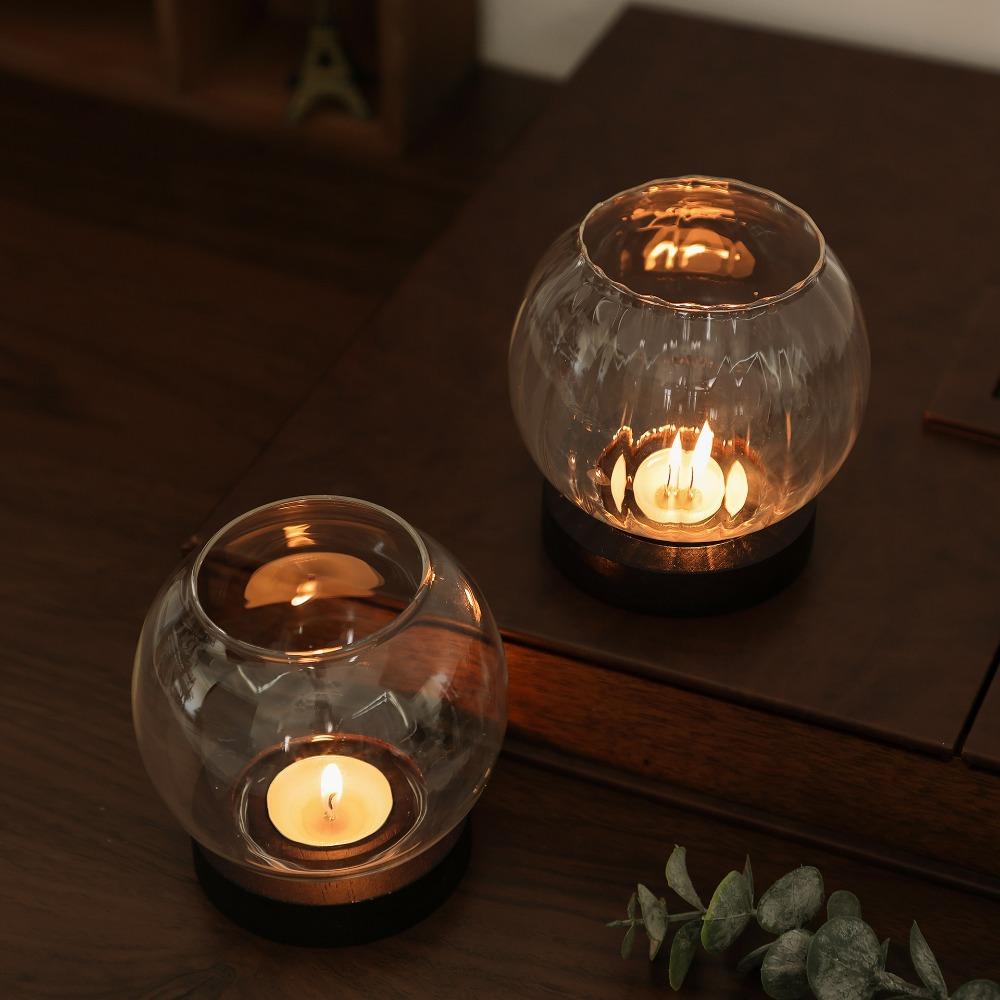 Romantic Transparent Candle Holder with Wooden Base Retro Oil Lamp Shape Round Candlesticks Tealight Dinner Table Decoration