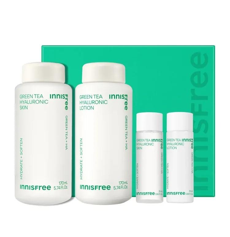 Keep your skin fresh and deeply hydrated with the Innisfree Green Tea Hyaluronic Acid Skincare Set. Powered by Jeju green tea extract and hyaluronic acid, this moisturizing duo helps replenish hydration, balance the skin, and maintain a healthy moisture barrier. The toner refreshes and prepares the skin, while the lotion locks in moisture for a soft, smooth, and radiant complexion. Ideal for daily skincare for dehydrated or normal skin types.