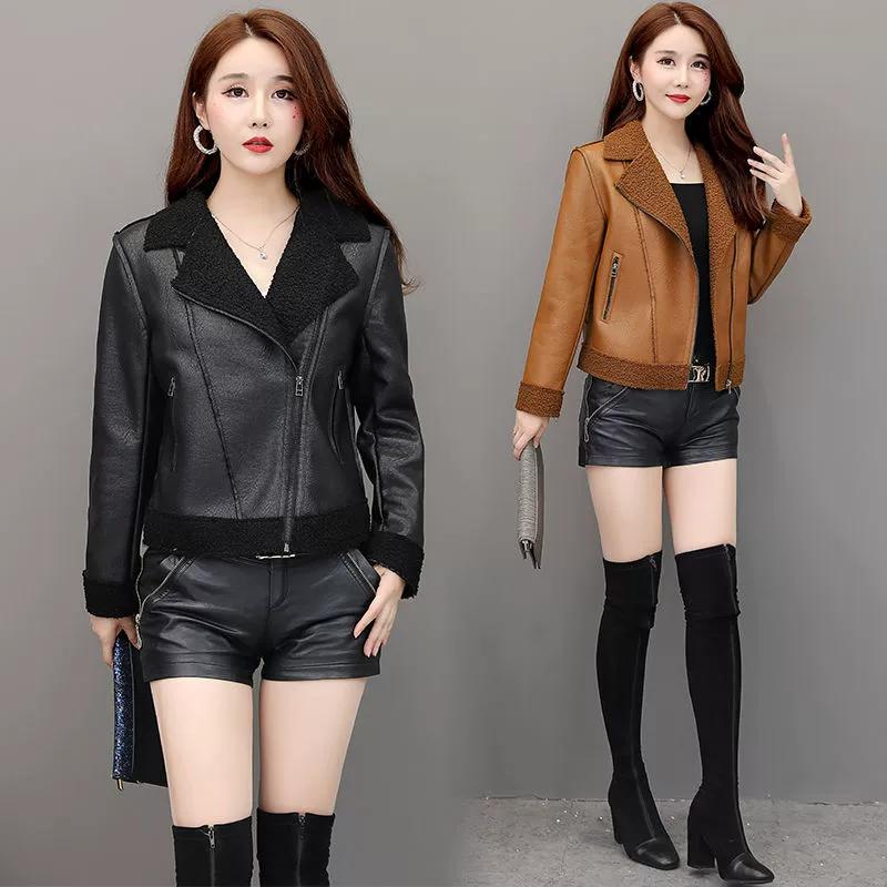 Autumn and Winter New Women's Leather Short Jacket PU Imitation Lamb Velvet Leather Jacket with Lapel