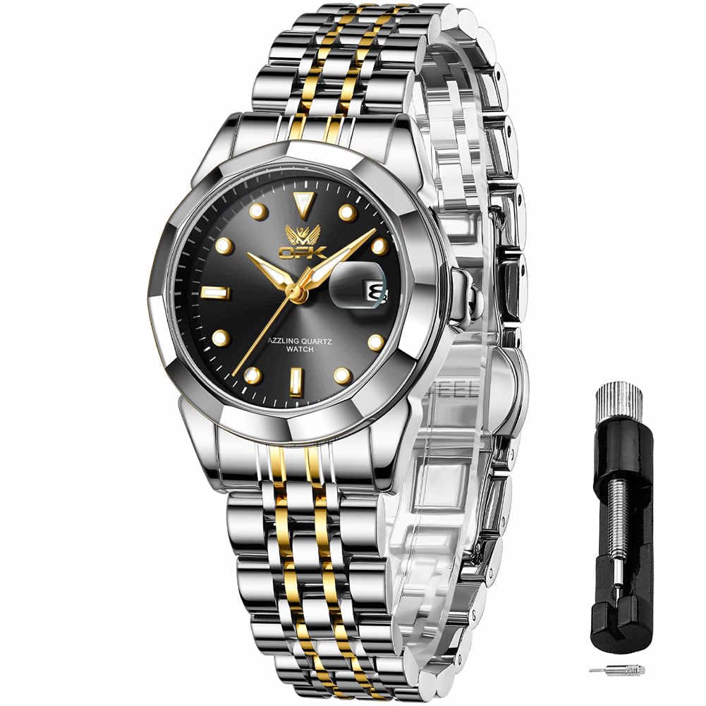 OPK Quartz and Date Luminous Stainless Steel Black and Gold Women's Watch, Fashionable, Popular, Casual, Gorgeous, Lightweight, Easy-to-Read, Display,
